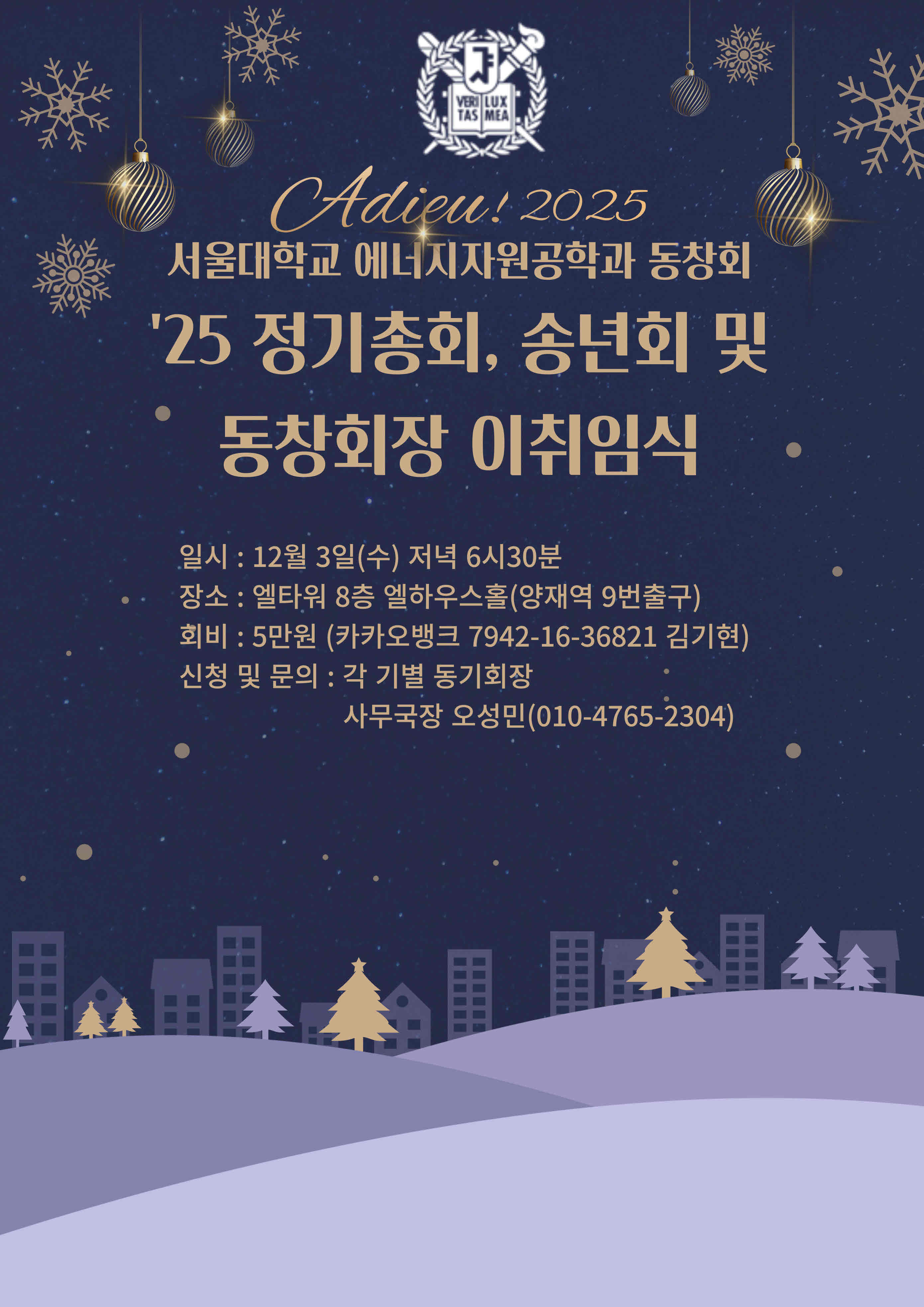- 일시 : 2025년 12월 3일(수) 저녁 6시~9시 - 엘타워 8층 엘하우스홀(양재역 9번출구) - 세부일정 : * 6시~ 접수 및 입장 * 6시30분~7시20분 석식(뷔페) * 7시25분~8시50분 정기총회, 송년회 및 회장 이취임식, 축하공연 - 참석자 : 동문 및 학과/재학생 100여명
